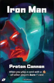 Iron Man always likes to be on the attack. Iron Man wants to burn as many cards as possible from the other players decks, and try to eliminate multiple players at a time to win. So, you want to play as many Danger Icon Cards as you can to keep the pressure on. Keep in mind that every time you play a Danger Icon Card you will have to flip a Danger Card.